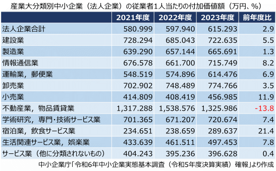 2023年度の法人企業合計は615万円で、前年度比2.9%の増加となりました。産業別の付加価値額をみると、不動産業,物品賃貸業だけが1,000万円を超えています。次いで、卸売業、建設業、学術研究,専門・技術サービス業、情報通信業が700万円台となりました。